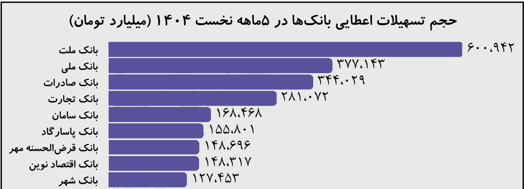 براساس دادههای بانک مرکزی که تا انتهای مردادماه سال 1404 منتشر شده، مجموع بانکها در 5 ماهه نخست سال جاری حدود 3 هزار و 234 هزار میلیارد تومان تسهیلات اعطا کردهاند که سه بانک ملت، ملی و صادرات به ترتیب با حدود 601 همت، 377 همت و 344 همت در رتبههای اول تا سوم قرار دارند. بانک تجارت با اعطای 281 همت در رتبه چهارم و بانک سامان با 168 همت در رتبه پنجم قرار دارد. از موضوع قابل تأمل در این جدول، رتبه ششمی بانک پاسارگاد با 156 همت تسهیلات و رتبه هفتمی بانک قرضالحسنه مهر با 149 همت تسهیلات اعطایی است. همچنین این دادهها نشان میدهد، بانک رفاه با 104 همت تسهیلات پرداختی در رتبه 11، و بانک سپه با 99 همت تسهیلات در رتبه 12 قرار دارد. طبق این دادهها، حدود 1772 همت معادل 55 درصد از کل تسهیلات اعطایی بانکهای کشور را 5 بانک شامل بانک ملت، ملی، صادرات، تجارت و سامان پرداخت کردهاند، درحالیکه سهم 10 بانک انتهایی تنها 4 درصد است.