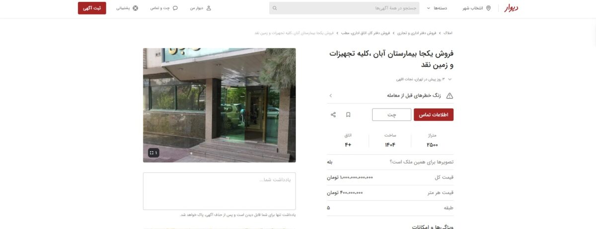 مثبت نیوز – آگهی فروش بیمارستان تخصصی آبان در دیوار آنهم به شکل درج آگهی فروش یک آپارتمان معمولی، منتشر شده است.